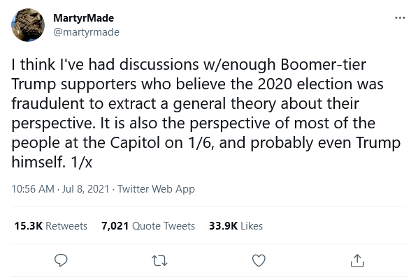 I think I’ve had discussions w/enough Boomer-tier Trump supporters who believe the 2020 election was fraudulent to extract a general theory about their perspective. It is also the perspective of most of the people at the Capitol on 1/6, and probably even Trump himself. 1/x