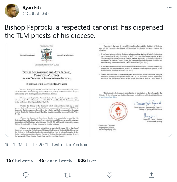 In a July 19 decree obtained by CNA, Bishop Thomas Paprocki, a canon lawyer, dispensed two parishes in his diocese from an article of Pope Francis’ July 16 motu proprio, meaning they will be allowed to continue to celebrate Masses according to the 1962 Missal.