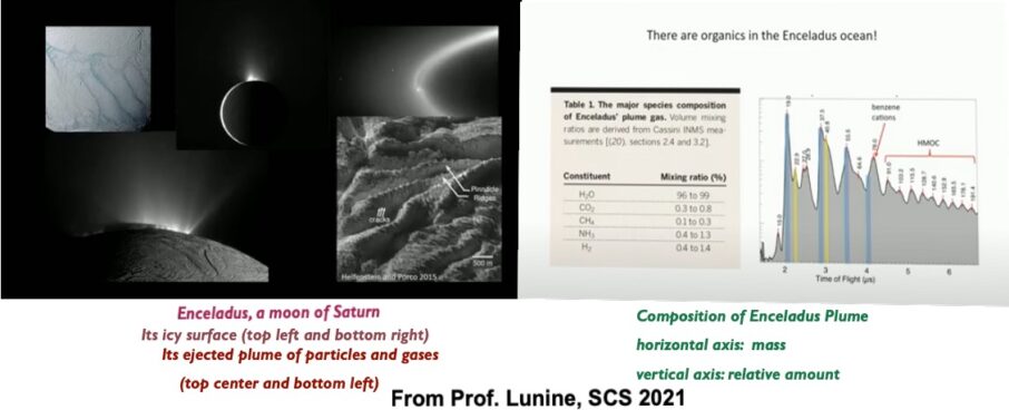 Even though the outer planets are so far away from the sun that they receive little energy, two satellites (Europa—Jupiter and Enceladus—Saturn) have liquid water oceans covered by a relatively thin sphere of ice. The high temperature necessary for liquid water to exist is provided by internal vulcanism and tidal effect from the massive planets which the satellites orbit. According to Professor Lunine, Enceladus is probably the most likely to contain evidence for cellular life.  Moreover, there is evidence that Enceladus’s ocean does contain organic molecules. Enceladus emits a plume of particles and gases at its south pole. Sample from this plume reveal, besides H2O, NH3, CH4, organic molecules, as the figure below shows.