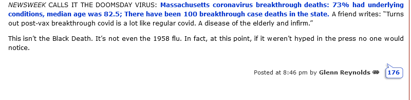 Frank, that’s my issue. I’m not in the science/math/stats world. My eyes typically glaze over at the sight of too many numbers or equations. But it seems if 1) the Delta Variant is both far more contagious and far more deadly, 2) the unvaccinated make up 95% or more of all new cases, and 3) Delta is the main cause of the new spikes in cases, then shouldn’t the deaths be soaring leaps and bounds above where they were a year, or even half a year, ago? In our state, the deaths have, thank the Lord, been relatively few. Something to my amateur way of thinking doesn’t make sense.