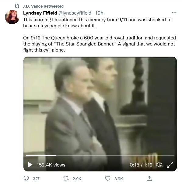 On 9/12 The Queen broke a 600 year-old royal tradition and requested the playing of “The Star-Spangled Banner.” A signal that we would not fight this evil alone. pic.twitter.com/pmxqSwNvTe