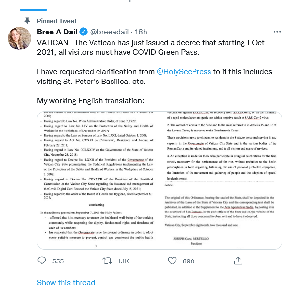 This policy has been in place for the Museums for a while now. There’s an exception for Masses. From what I recall, the same policy is in place across Italy, for tourism only. I don’t think a non-Italian tourist can get anywhere without a Green Pass anyway.