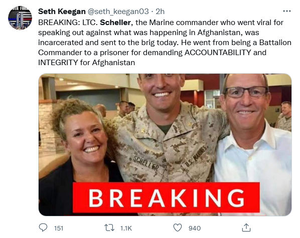 At this point, I think LTCOL Scheller acted foolishly and will get eaten alive by the military establishment and will not help his stated cause. In fact, it may very well hurt it. I can’t help but wonder if Scheller used this Afghanistan debacle as an opportunity for publicity.