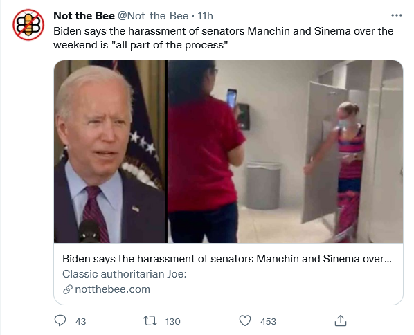 When asked about the tactics of activists harassing Sen. Sinema in bathroom he very softly criticized and downplayed as “part of the process.”pic.twitter.com/IroUgc4URZ