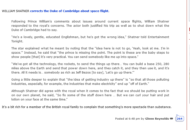 Hopefully William isn’t quite the imbecile that his father the plant talker is, but the signs are not good.  Thank God for Americans this is purely of academic interest.  Go here to Instapundit to comment.  Shatner, get yourself naturalized as an American before you depart on the voyage from which there is no returning.