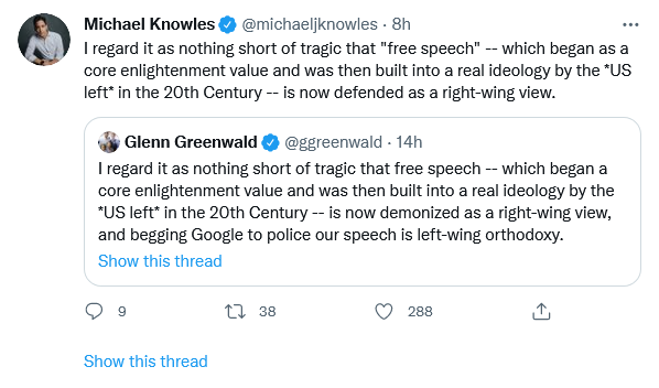 With most Leftists, Glenn Greenwald and others being honorable exceptions, defending free speech had a sell by date: only so long as it was convenient for them. The Left, most of it. is all about power to implement its agenda of the moment. Everything else is empty verbiage, to be reversed in an instant if the politics of the day call for it.