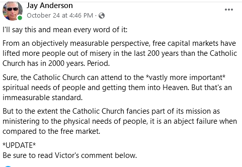 I think CST is conceptually flawed on economics because churchmen think in moral terms, not economic terms. But … (1) economics is the science of commodity relationships, which are definitionally among strangers who do not love each another.* The Church, by its nature, conceives of all human relationships as guided by love and measured accordingly; (2) the Church itself, even in the economic realm, runs on love (i.e., donations), which among other things means economic incentives and profit are a foreign language to churchmen; and (3) the Church’s rejection of consequentialism makes churchmen blind to such paradoxes as the virtue of self-interest.