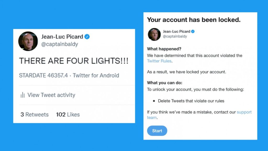 CELTRIS III—Jean-Luc Picard has been removed from Twitter following his controversial “There are four lights!” tweet. The highly respected Captain of the USS Enterprise starship has reportedly been removed until he agrees to delete the tweet.