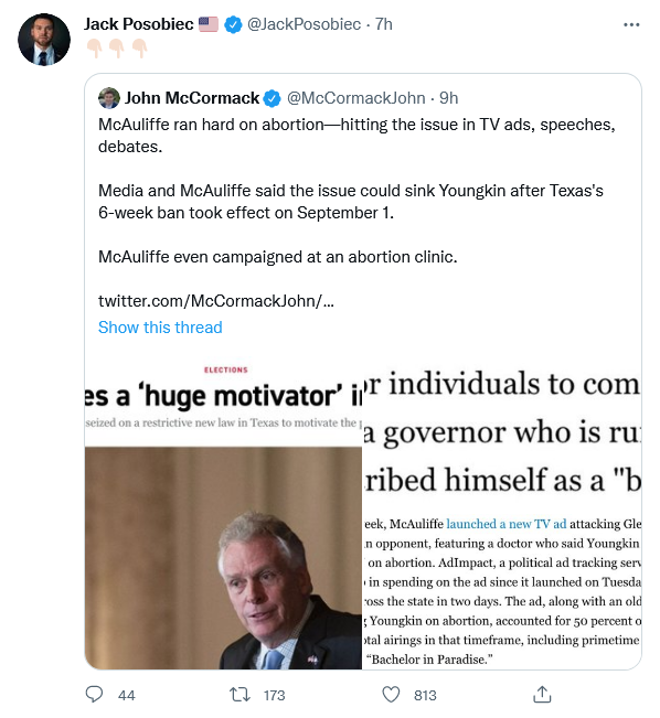 NOV 03 at 0048: FOX NEWS, NEWS MAX call Virginia for Youngkin for governor; Winsome Sears, Lt Gov.; Jason Miyares AG. (Thank God the awful current AG pro abort and liar Herring lost.)