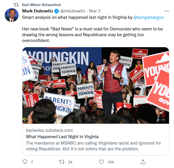 It’s no wonder Youngkin did better with working-class voters of all races. And not just better than McAuliffe, but better than Trump. And he did well elsewhere, too; 14 percent of black women—double Trump’s showing in Virginia—backed the Republican candidate.