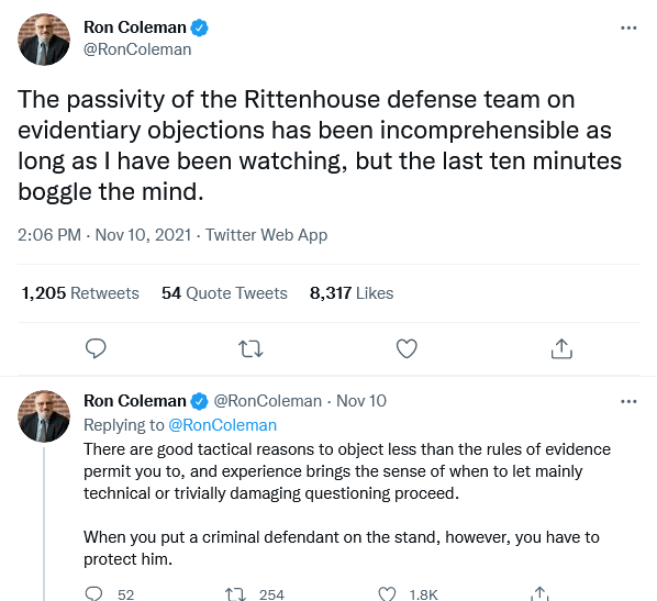 I have never been an attorney to object for the sake of objecting. I am not in court to enforce the rules, that should be the function of the court. I object only when I think it will serve the interests of my client. In a jury trial an attorney must also weigh the legitimacy of an objection against its perceived impact on a jury. Sometimes an objection may underline something for a jury, convince them that it is important and that the guy making an objection is trying to hide the Truth from them. Having said that, it was clear that Rittenhouse’s counsel have been too reluctant to make necessary objections, for whatever reason. When it comes to objections, don’t be this guy: