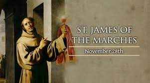 James Gangala was born at Montebrandone, Ancona. He studied law and then joined the Franciscans at Assisi in 1416. He studied under St. Bernardino of Siena at Fiesole, was ordained when he was twenty-nine, and became an effective and forceful preacher. He worked as a missionary with St. John Capistran in Italy and in Germany, Bohemia, Poland, and Hungary, and in 1426, with John, was named inquisitor against the Fraticelli by Pope St. Martin V. They destroyed thirty-six Fraticelli houses, and their severity (some of the Fraticelli were burned at the stake) and their tactics resulted in great violence and caused many objections. James attended the Council of Basle-Florence, and helped reconcile Hussites, but was unsuccessful in attempts to reconcile the Observant and Conventual Franciscans. In 1456, he was sent to Austria and Hungary to combat the Hussites. He refused offer of the See of Milan, and in 1462 became involved with the Inquisition because of a sermon he preached at Brescia. The case caused a sensation and was referred to Rome; silence was imposed on all parties, and no decision was ever rendered. He died in Naples, where he spent the last three years of his life, on November 28th. He was canonized in 1726 as St. James of the Marches. His feast day is November 28th.