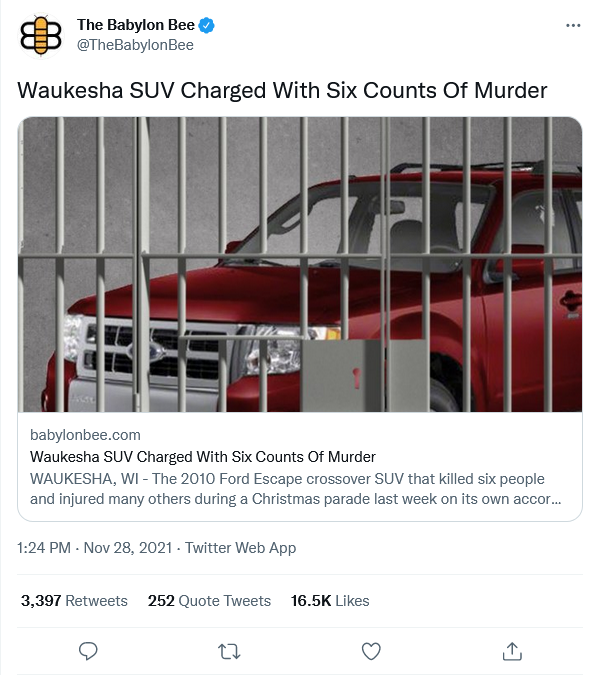 “Rest assured — we will hold this dastardly SUV accountable,” said a Waukesha prosecutor. “What this vehicle did to those victims is unconscionable. We will be throwing the book at this car to make sure it can never strike again. Justice will be served, and the people of our city will be able to rest easy knowing that this 2010 Ford Escape is behind bars for good.”