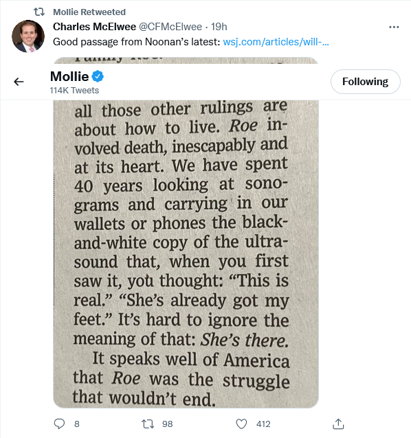 History teaches us that most causes that refuse to admit defeat, no matter the odds against them, stand a very good chance of ultimately prevailing in the end. Good column by Peggy Noonan, but, ironically, we are where we are at now due to President Trump, who Noonan opposed. God ever uses the most unlikely clay to work His will. I have been proud of many things in this life, but outside of my family and the Faith, I have never been prouder of anything than standing with my stalwart brothers and sisters of the Pro-life Movement.