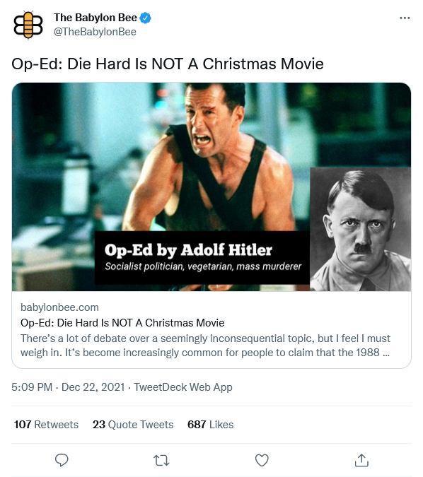 It’s a funny tongue-in-cheek piece and “Die Hard” (and the second “Die Hard”) are as much Christmas tales as “Ruddolf the Red Nosed Reindeer,” perhaps more so.