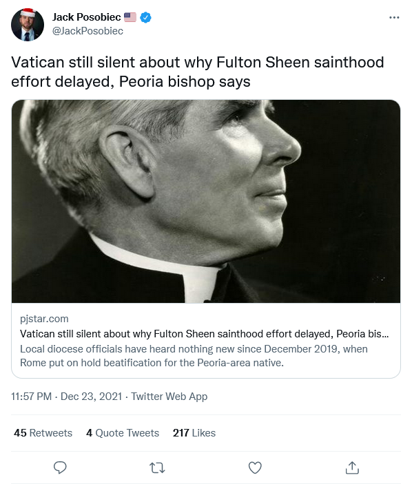My bride and I still watch Life is Worth Living at least once a week thanks to EWTN and the DVR. If the pathetic hierarchy with which the faithful suffer today think they are changing anything by acting like Mean Girls™️ concerning this case, they have a large surprise coming. I agree with Foxfier, we will continue to regard Abp. Sheen as a saint regardless. And I continue to have my doubts about some of the recent canonizations and beatifications, which seem more political than anything else. Not trying to start a war of words here about whether canonizations are infallible. All I know is that I am not sure they are, and there is much room for debate. To me, the Sheen case is evidence against the proposition of infallibility. Further your affiant sayeth not. 😉
