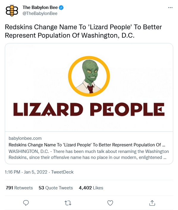 The District of Columbia informed the team that they cannot return to playing within the district until they have a name that is more fitting for a team representing the capital of our country. To that end, the team officially announced today they would be renaming themselves to “The Washington Lizard People.”