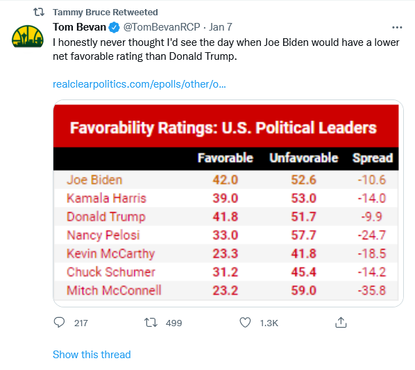 I can’t help noting that of all the pols on that list, Trump has the lowest negative spread. And you know the sample was likely skewed to the left, as they almost always are. Add to this the fact that Trump is still showered with hatred daily from every “major media outlet” while Biden is generally canonized by the same sources, and you get a feel for what a total disaster this “Presidency” is. Stolen elections have consequences.