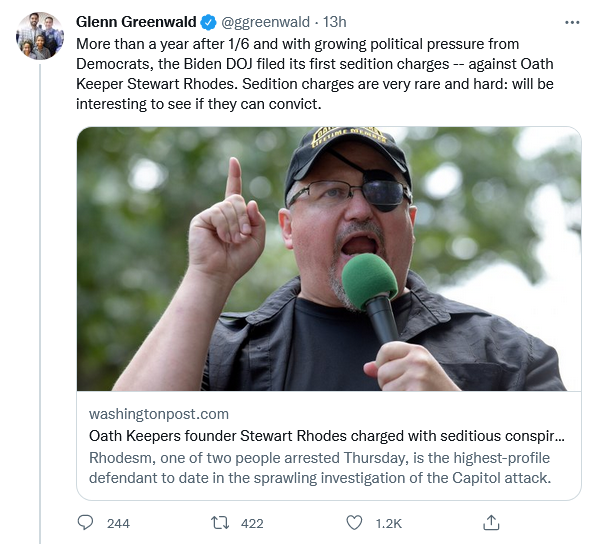 Go here to read the rest. Now we know why the Feds adopted a kid glove approach to Oath Keeper’s Ray Epps. They were using him to phony up seditious conspiracy charges against the leadership of the Oath Keepers. I am sure this will follow the usual course of such Fed made conspiracies. The Fed participants will be the ones who will actually be the movers and shakers in the plot. The non Fed participants will express doubts and reluctantly be pulled along by the Fed participants. In this type of case seditious conspiracy is spelled e-n-t-r-a-p-m-e-n-t. Let the legal farce begin.