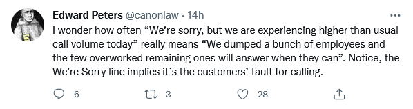 Answering the calls costs them money. Doing something about customer problems costs them money. The call in experience, often with people from the subcontinent paid slave labor wages, is made as unpleasant as possible to get customers to give up and hang up. My Bride has far more persistence and patience than I do and always gets through, whether at home or in the law mines, and then baffles them with her calm and logic until the problem is cured or we get a full refund. She is the velvet terminator who keeps coming and coming at them until her objective is obtained. It shouldn’t require her awesome skill set for companies to give meaningful support.