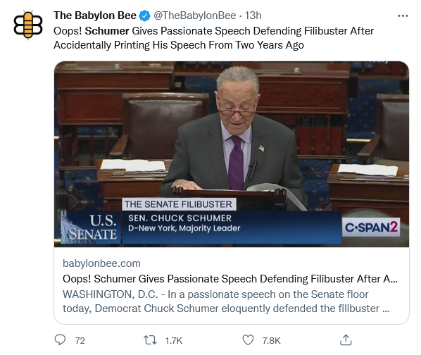 WASHINGTON, D.C.—In a passionate speech on the Senate floor today, Democrat Chuck Schumer eloquently defended the filibuster before suddenly realizing he was reading one of his old speeches from two years ago.