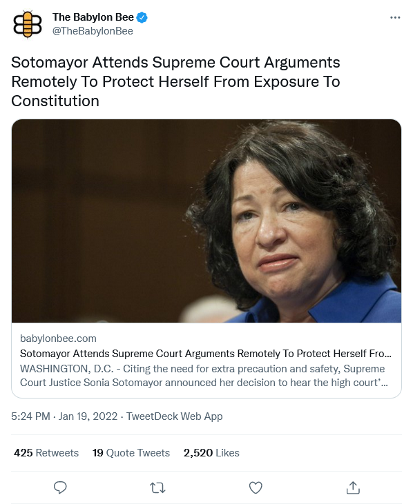 “I read online that exposure to the Constitution causes over 100,000 Americans to become white supremacists every day,” said Justice Sotomayor while wearing a face shield and three masks over a Zoom call. “These scientific facts have informed my decision to stay as far away as I can from the dangerous document.”