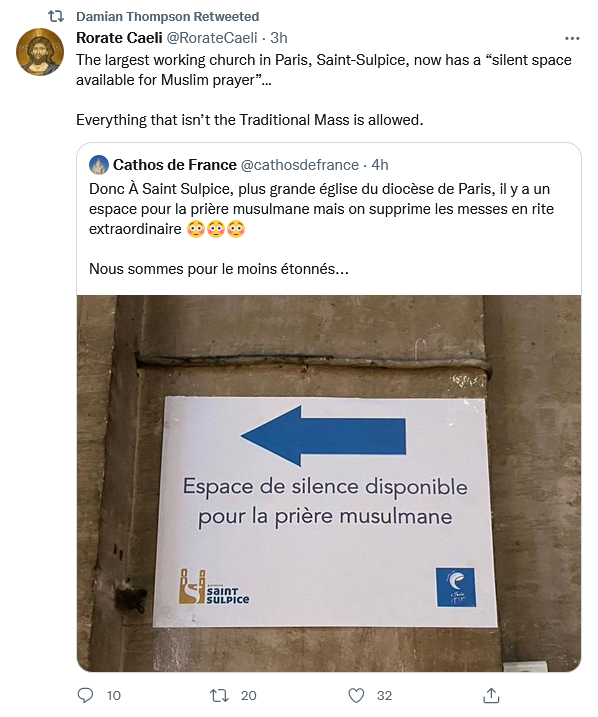Reflect for a moment on the insanity of St. Sulpice suppressing any celebration of les messes en rite extraordinaire to promote unity, and turning consecrated space over to islam— also under the pretext of ‘unity’.
