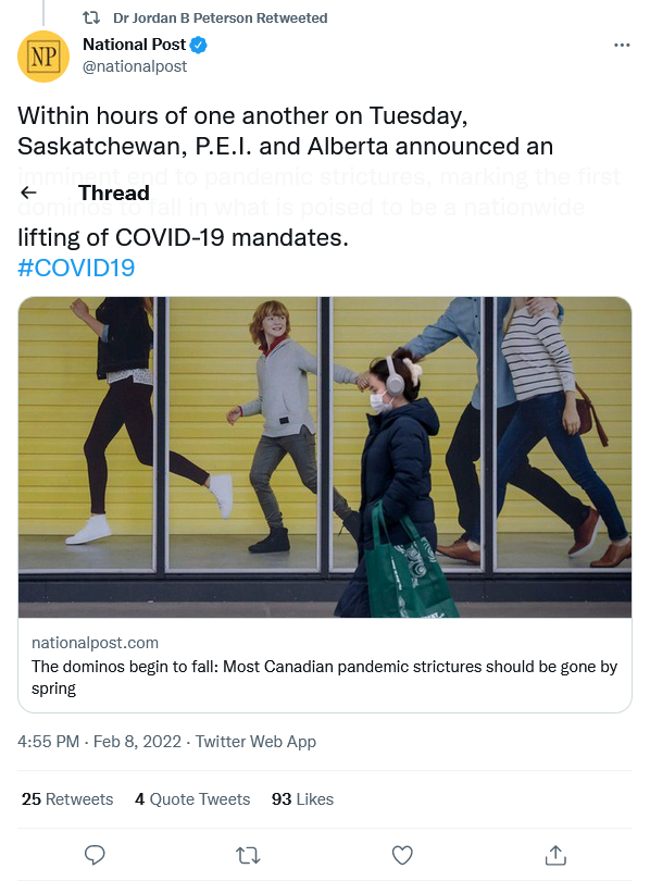 Go here to read the rest. With the Province of Alberta announcing the dropping of all Covid restrictions the dam is breaking. We are seeing a political miracle wrought by The Freedom Convoy against a corrupt and dysfunctional political establishment. May their tribe increase around our globe.