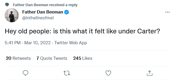 I was twenty-three in 1980 and there was a great feeling that the wheels were coming off the country, which directly led to Reagan’s landslide victory in the fall. Bad enough to live through that period in my twenties, but having to do it again in my sixties, seems to be unwarranted in one life. May we have another Reagan to set things right again.