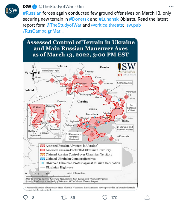 Russian forces again conducted few ground offensives on March 13, only securing new terrain in Donetsk and Luhansk Oblasts. The Ukrainian General Staff reported that Russian forces predominantly took measures to restore combat readiness and regrouped combat units as of noon local time on March 13.[1] Russian forces continue to assemble reinforcements and attempt to improve logistical support in both the Kyiv and southern operational directions. Russian forces may intend to resume larger-scale attacks on both axes of advance in the coming week, but will likely take longer to (or may never) cohere the combat power necessary to complete the encirclement of Kyiv.