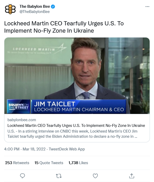 U.S.—In a stirring interview on CNBC this week, Lockheed Martin’s CEO Jim Taiclet tearfully urged the Biden Administration to declare a no-fly zone in Ukraine.
