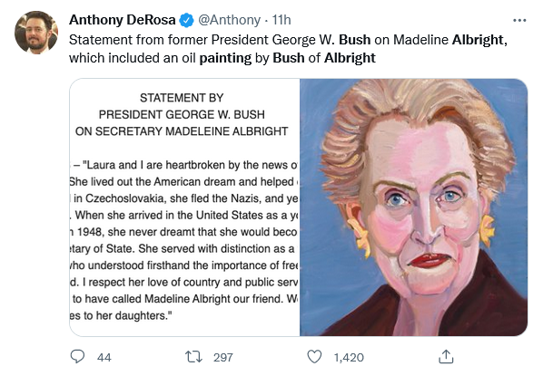 That painting of the now-late Madeline Albright is truly frightening. Perhaps George W. Bush truly caught Albright’s inner person.
