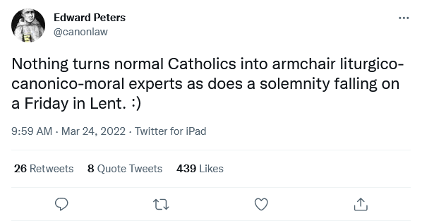The widespread chattering about how a solemnity affects the rubrics of Lent might actually be meaningful if the Church still required an actually meaningful regimen of fasting and abstinence throughout the season. To back out of abstaining from meat on one of the only seven days per YEAR that abstinence is required seems more than a little bit self-indulgent. The UK bishops got it right, IMO, when they re-instituted the rule of abstinence for all Fridays throughout the year.