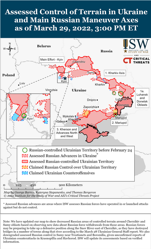 - We now assess that Russian forces have given up on encircling or seizing Kyiv at this time. Russian forces continue to fight to hold their current front-line trace near the city, however, remaining dug into positions to the east, northwest, and west. Russian forces withdrawing from the area around Kyiv appear to be moving north from behind the front line to positions in Belarus.