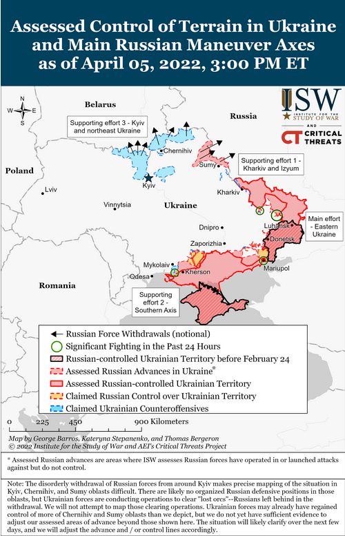 Russian forces continued to reposition to continue their invasion in eastern and southern Ukraine, having abandoned the attack on Kyiv. They have largely completed their withdrawal from the Kyiv area and are reportedly redeploying some of the withdrawn combat forces from Belarus to Russia. Ukrainian forces are moving to regain control over segments of the state border in Chernihiv, having already done so in Kyiv and Zhytomyr Oblasts. Russian troops are pulling back toward Russia along the Sumy axis as well, but it is not yet clear if they intend to retreat all the way back to the border or will try to hold some forward positions on the Sumy axis.