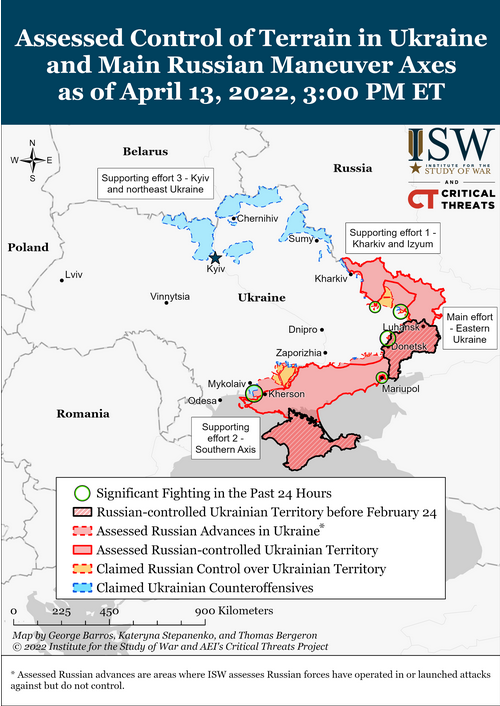 Russian claims of a mass Ukrainian surrender in Mariupol are likely false, but Russian forces forced Ukrainian troops to abandon the Ilyich metal plant in northern Mariupol on April 13, further constricting the two remaining pockets of Ukrainian defenders. Russian forces will likely capture Mariupol in the coming week. Russian forces continued to conduct small-scale limited offensive operations on both the Izyum and Severodonetsk axes and have not yet begun a broader offensive campaign.
