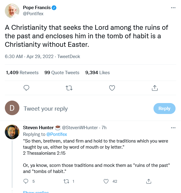 Sigh.  I don’t write you as much as I should.  Too upset most of the time.  Father Supercilium told me today that since the Pope no longer is very mobile he has been tweeting up a storm.  The above is a sample and a response.  I don’t wish to be judgmental Diary, but the Holy Father on his own can’t tweet his way out of a wet paper sack.  He has no gift for writing and merely repeats what he has said so often.  I really wish that I could return to Nashville and my happy convent life.  The garden and the compost heap call to me, and if the Holy Father is going to be doing his own tweets anyway, what good am I doing?  I asked permission to leave last month and Father Supercilium said the Pope said no.  According to Father Supercilium his exact words were:  “No!  Tell that gringa sister that she will stay here since she thinks like the young morons on  Twitter and that may still be useful to me.”  The Holy Father has always been somewhat grouchy but the pain in his legs make him a Holy Terror to be around.