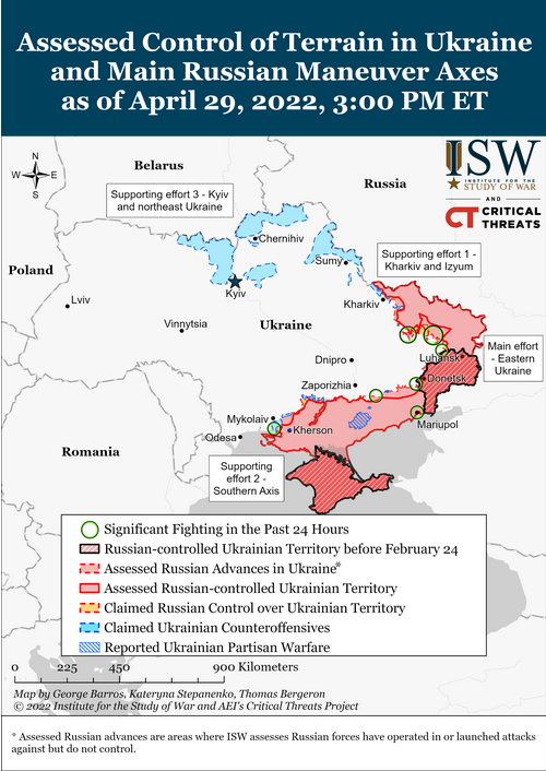 Russian forces made limited advances west of Severodonetsk on April 29 but remain stalled south of Izyum. Ukrainian forces in eastern Ukraine are likely successfully conducting a maneuver defense rather than holding static positions, redeploying mechanized reserves to resist attempted Russian advances. Concentrated Russian artillery is enabling minor Russian advances, but Ukrainian positions remain strong. Limited Ukrainian counterattacks around Kharkiv city may additionally force Russian forces to redeploy units intended for the Izyum axis to hold these positions.