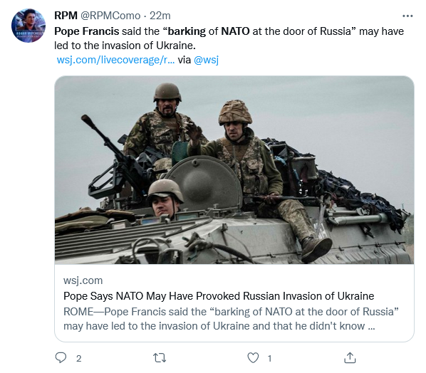 Actually, it was Biden, as leader of the leading power in the West, turning into a little more secular version of Francis himself that lead to the invasion. Didn’t happen on Trump’s watch.