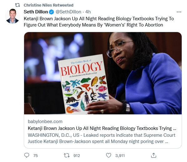 WASHINGTON, D.C., US—Leaked reports indicate that Supreme Court Justice Ketanji Brown-Jackson spent all Monday night poring over biology textbooks to learn what a woman is so she could defend a woman’s right to abortion on Tuesday.