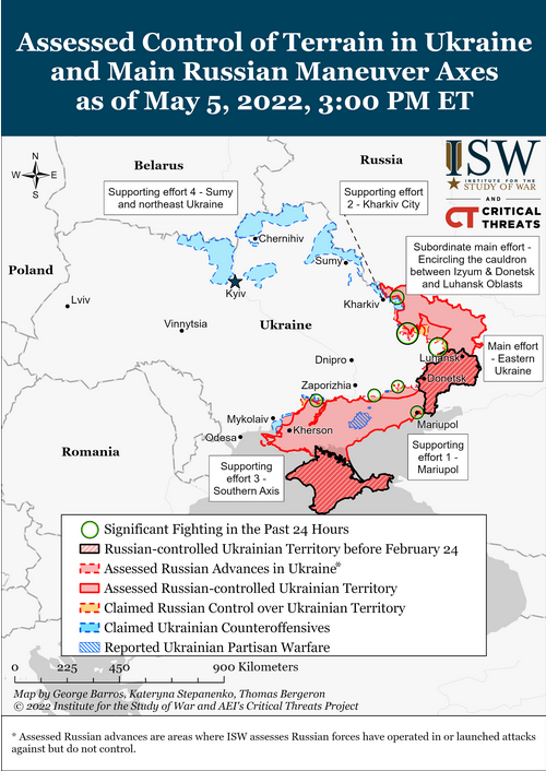 The Ukrainian counteroffensive out of Kharkiv city may disrupt Russian forces northeast of Kharkiv and will likely force Russian forces to decide whether to reinforce positions near Kharkiv or risk losing most or all of their positions within artillery range of the city. Ukrainian Commander-in-Chief Valerii Zalyzhnyi stated on May 5 that Ukrainian forces are transitioning to counteroffensive operations around Kharkiv and Izyum, the first direct Ukrainian military statement of a shift to offensive operations. Ukrainian forces did not make any confirmed advances in the last 24 hours but repelled Russian attempts to regain lost positions. Russian forces made few advances in continued attacks in eastern Ukraine, and Ukrainian forces may be able to build their ongoing counterattacks and successful repulse of Russian attacks along the Izyum axis into a wider counteroffensive to retake Russian-occupied territory in Kharkiv Oblast.