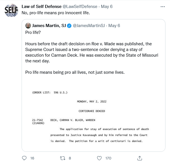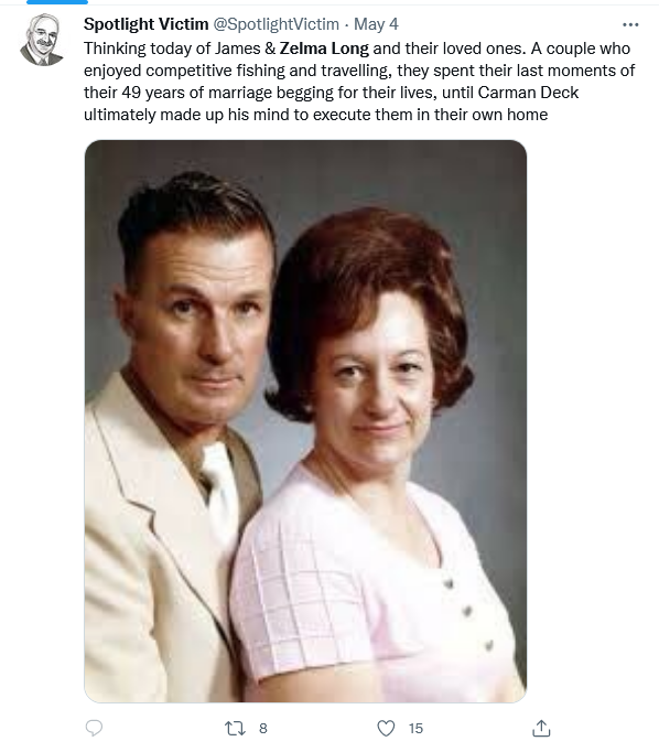 Deck was executed for a double homicide he committed over a quarter century ago. He burglarized the home of James Long, 69, and Zelma Long, 67. They told him to take what he wanted but to spare their lives. He shot them each in the head. They had seven kids. It takes a special type of ghoul to compare the just execution of their murderer with abortion.