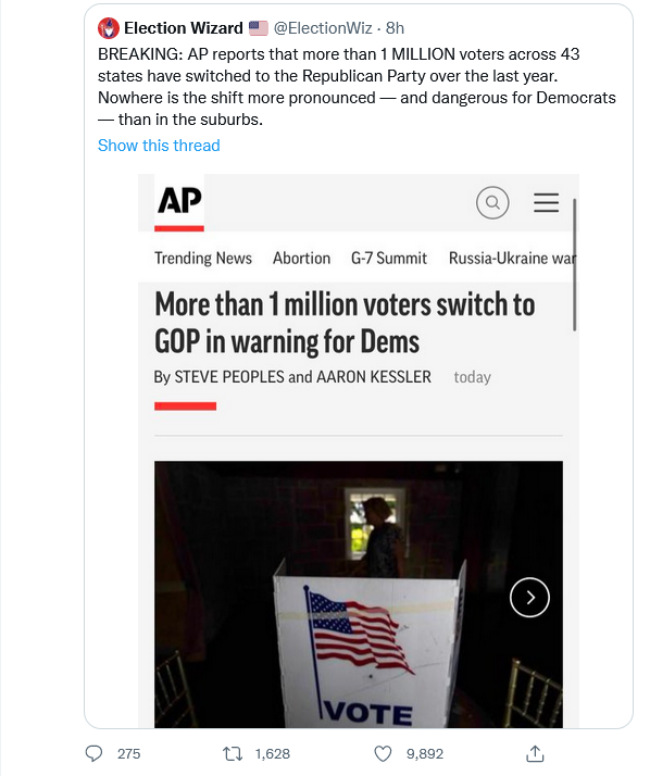 No, I’m not saying that the party switch is all of it, but it seems folks are very, very optimistic about a red wave. All during 2020, it seemed so sure that Trump would win, but here we are with Biden and $5 plus a gallon gas and food shortages