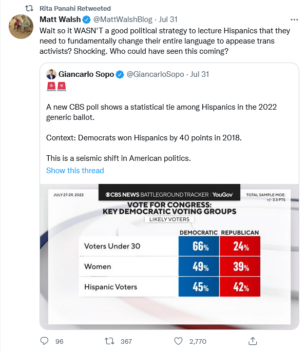 The Democrat Party today largely reflects the policy concerns of young Leftist college graduates.  Their number one concern seems to be their completely screwed up views on sex.  Thus, if they have to choose between transgenderism and Hispanics, transgenderism wins every time.  The modern Democrat party has some of the features of a cult, and increasingly it is a suicide cult.