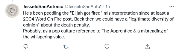 Elijah fired because he had the prophets of Baal executed after they lost the battle of the Gods on Mount Carmel? The same Elijah who communed with Jesus during the Transfiguration? Of course there is not a scintilla of evidence to support this absurdity in the Old Testament account. Bishop Barron always struck me as an intellectual light weight, with some talent as a popularizer, but this goes well beyond being wrong into the territory of simply lying in order to engage in obeisance to twenty-first century fake pieties. There are many ways to offer a pinch of incense to false gods and manipulating Scripture to serve current intellectual prejudices is one of them.