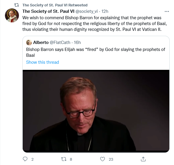 I get that many good Catholics love +Barron, but saying Elijah was "fired" by God for being too violent with Baal-worshippers is horrific modernist exegesis. It's the same disease as woke critics of the past: we apply our man-made modern standards to condemn previous generations. pic.twitter.com/bmmgVHCwQB