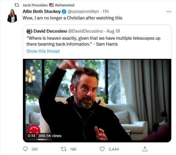 Jesus Christ is the revelation of God. If we fully understand who God is: God is the Infinite Supreme Sovereign Being, the first family of love. God is three Infinite Sovereign Persons. Infinite means without beginning and without end. Sam Harris had a beginning in the mind of God. All men are immortal for the purpose of God: Truth, Justice, Mercy. Let Sam Harris find Truth in the universe.