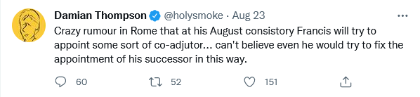Counter-argument: the idea that he of all people would share power is impossible to believe. He’s not a sharer, not even with a “vice-pope.”
