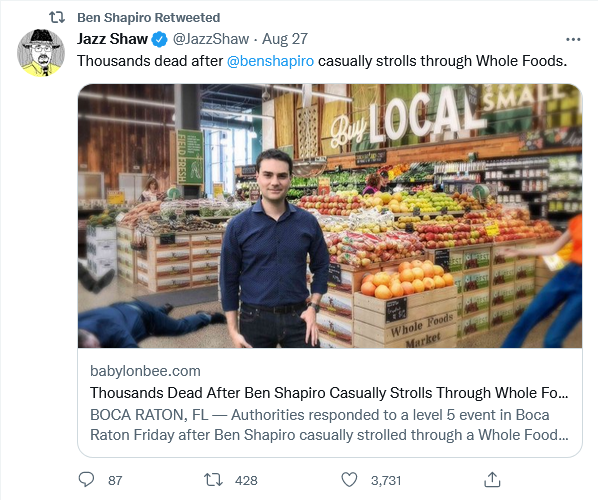 BOCA RATON, FL — Authorities responded to a level 5 event in Boca Raton Friday after Ben Shapiro casually strolled through a Whole Foods Market, resulting in the death of thousands.