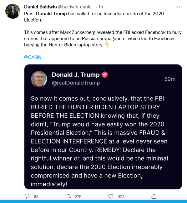There were virtually no evidentiary hearings conducted and Trump was denied meaningful discovery, including signature matches of mail in ballots. Where signature matches were made on a limited basis in Arizona, the results indicated that rejected ballots would have been far greater than the margin of victory for Biden. The Wisconsin Supreme Court recently ruled that the use of unsupervised drop boxes in 2020 violated the Wisconsin Constitution. Jeff Zucker has just revealed that the FBI asked Facebook to put a lid on the Hunter Biden story prior to the election. This list could go on with dozens of other entries. The Presidential election in 2020 reeks of fraud.